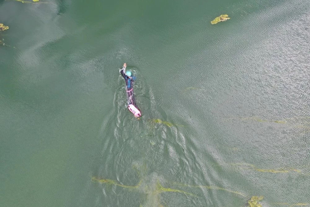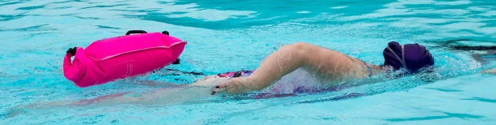 A brightly coloured high visibility inflatable dry bag with leash and waist belt. Ideal for storing kit whilst you swim and for increased visibility in open water. All our inflatable dry bags will easily support an adult’s weight if you need to rest.