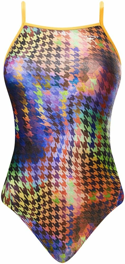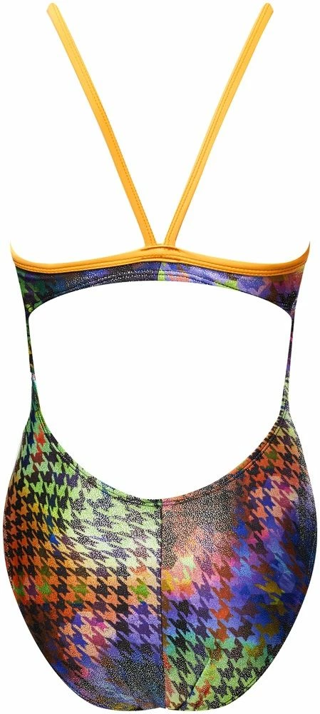 The Women’s Houndstooth Foil Wingback Swimsuit utilizes a sleek Poly/Spandex fabrication with a shiny foil finish to provide performance in and out of the water. Featuring a wingback design, the 7930A offers minimal side and hip coverage without sacrificing support or comfort. Thin straps, a high cut leg and full lining make this Funnies swimsuit a trendy alternative for training, as well as an ideal choice for swim teams, clubs and competitive swimmers who want style with an edge.