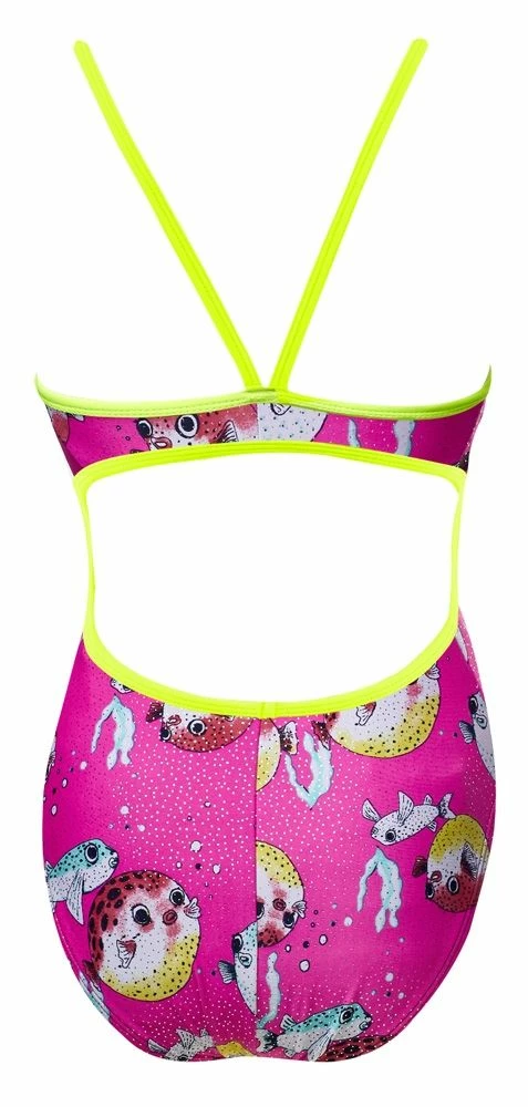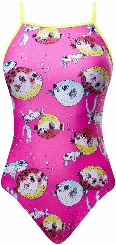 The Girls’ Reel it in Funnies Flutterback Swimsuit utilizes a sleek Poly/Spandex fabrication with a shiny foil finish to provide performance in and out of the water. Featuring a flutterback design, the 7931A offers additional side and hip coverage without sacrificing support or comfort. Thin straps, a moderate cut leg and full lining make this Funnies Swimsuit a trendy alternative for training, as well as an ideal choice for swim teams, clubs and competitive swimmers who want style with an edge.