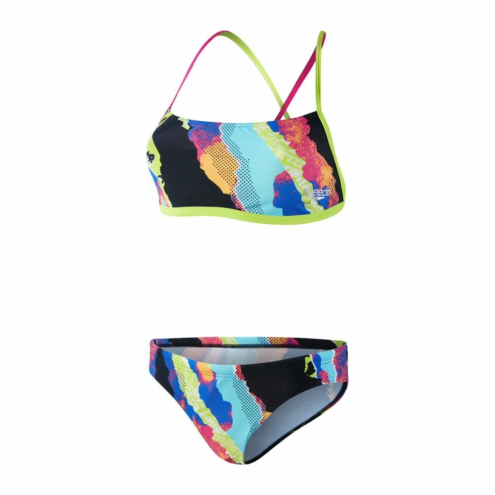 Fly down the lane wearing our on-trend Cross-Back Two Piece, featuring a ‘ripped up’ mix of bright colours and cool graphic prints. Comfortable and secure, so you feel confident during hard swim sets, the crop top is front-lined with thin crossback straps that sit between your shoulderblades, allowing great freedom of movement so you can train hard and feel great. Fully lined at the front for comfort and modesty, the low front rise brief includes a drawstring waist for a confident and secure fit during hard sessions.Designed to be durable and better for the environment, it’s made from our new ECO Endurance+ fabric which is 100% chlorine resistant, quick-drying and made using 50% recycled materials.