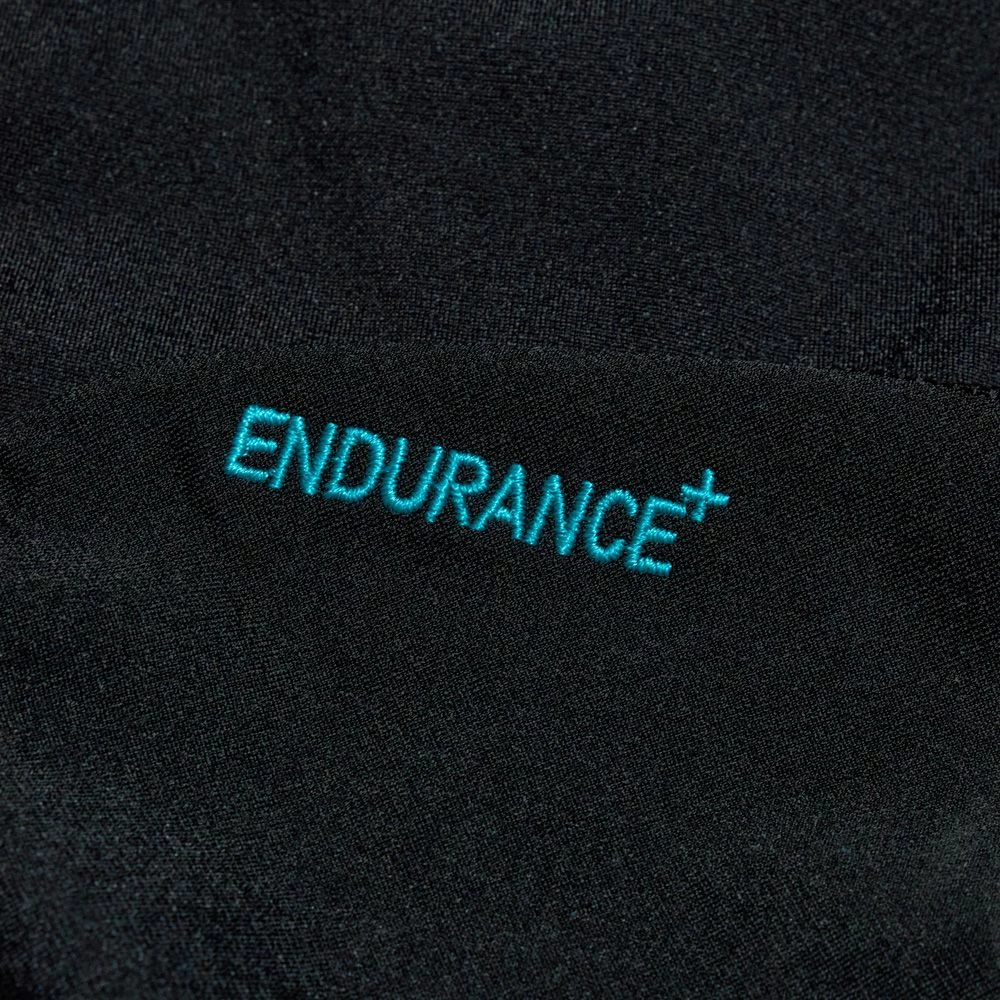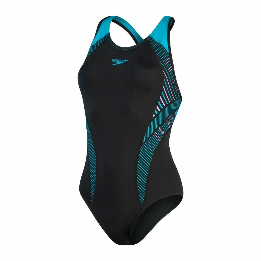 Stylish performance swimwear. Power through your workout wearing our flattering black Laneback swimsuit with contrasting turquoise straps and a subtle plastisol curve detail in lilac. The medium cut leg and bust underband ensure you feel comfortable and supported during your fitness training. Designed to be durable and better for the environment, the suit features our new ECO Endurance+ MAX fabric, which is 100% chlorine resistant, quick-drying and made from 100% recycled post-consumer waste.